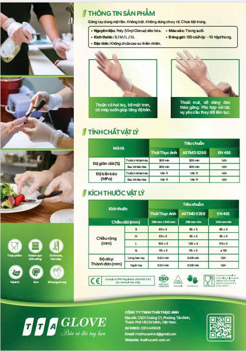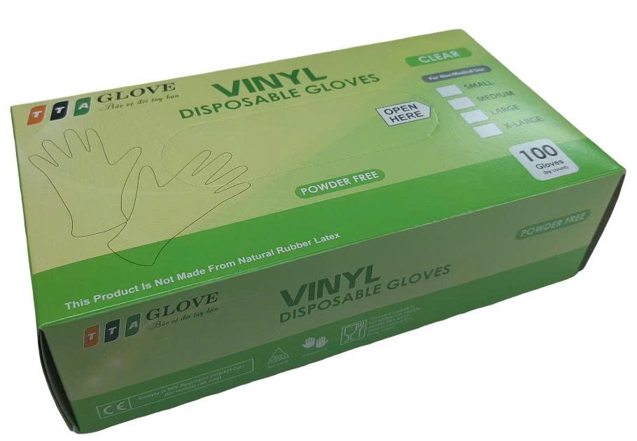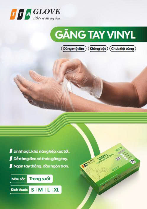 Găng tay Vinyl TTA Sản phẩm dùng một lần và thuận cả hai tay, mang lại cảm giác xúc giác tuyệt vời cho người đeo.
